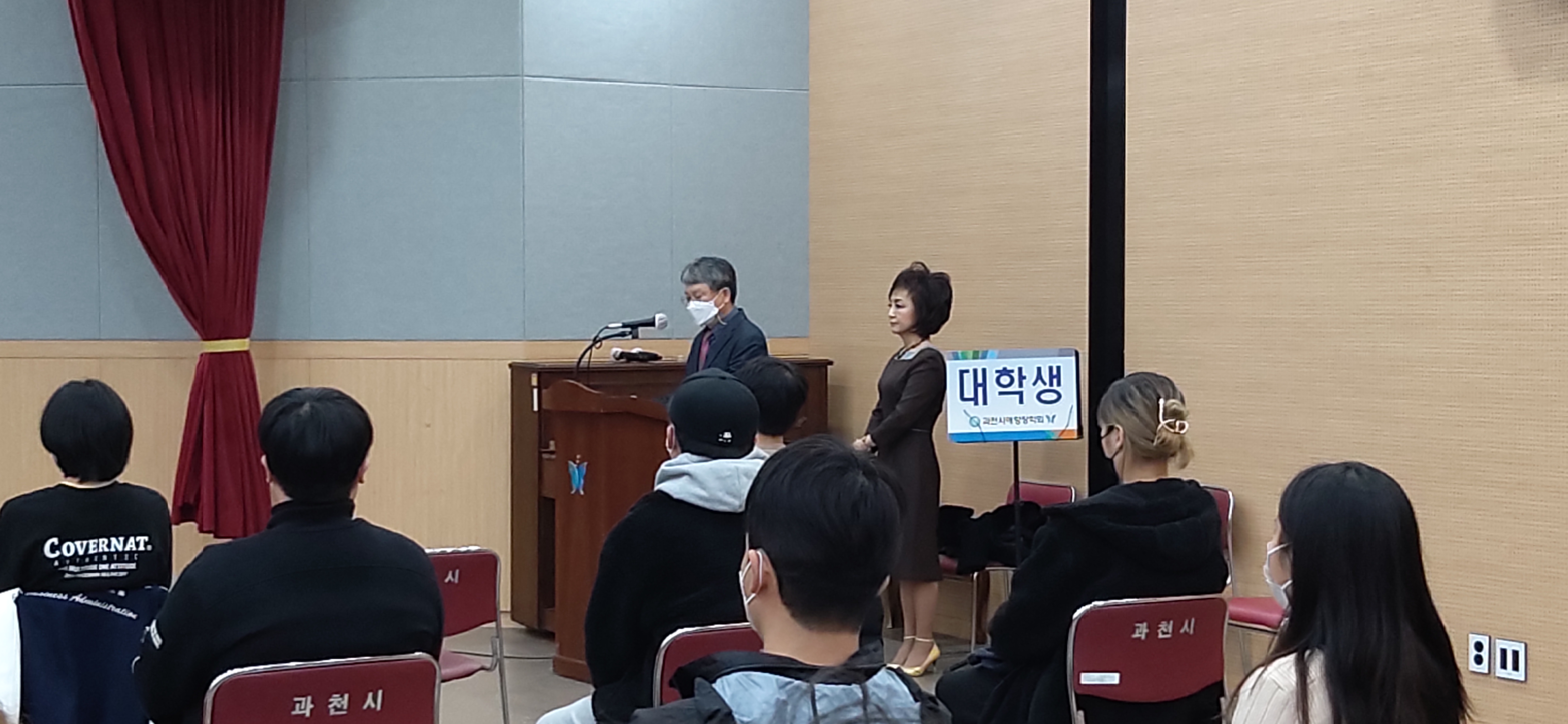과천시청 대강당에서 내빈 26명, 대학생 24명 모두 약 50여명이 참석하였습니다.